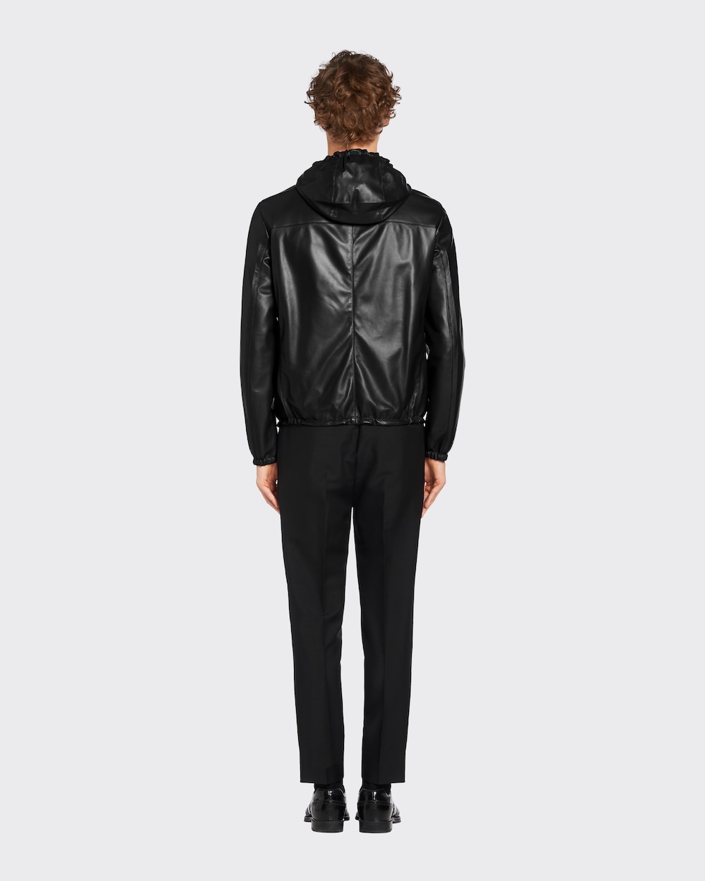 ストレートで洗練されたラインが特徴のリバーシブルのナッパレザー(羊革) ジャケット。内側には同系色のアイコニックなナイロンを使用。前身頃の縦型ファスナーが個性的なグラフィックなデザインを演出。