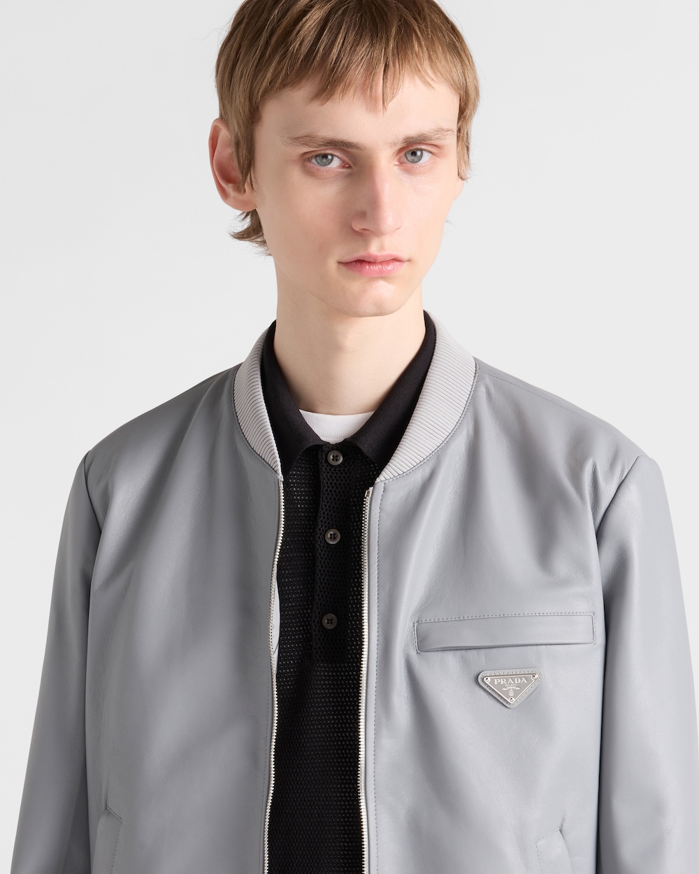 現代的なシルエットと洗練されたカットが魅力の、しっとりと柔らかなナッパレザー(羊革)のボンバージャケット。機能的でありながら洗練されたディテールをあしらい、襟と袖口をリブ編みしたファスナー開閉式のウェア。エナメルメタルのトライアングルロゴを飾り、カジュアルなジャケットにプラダらしいアクセントをプラスしました。