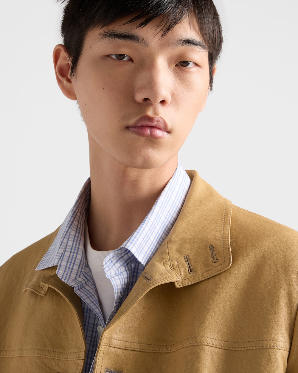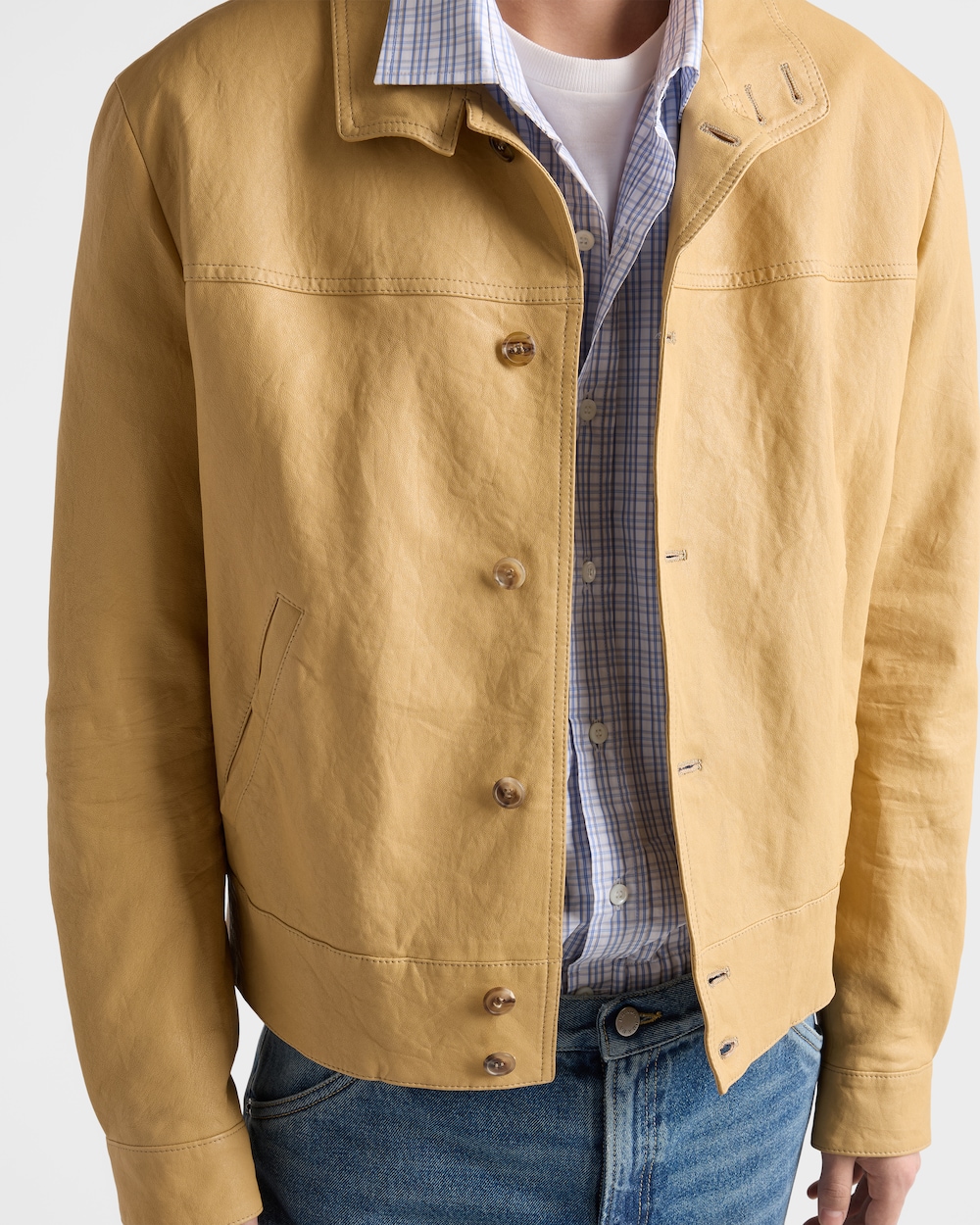 このジャケットは、独自のスタイルを持つハイブリッドなアイテムで、ラインと素材の意外な組み合わせが特徴です。柔らかく軽やかなナッパレザーがデザインにカジュアルな雰囲気を与え、ヴィンテージ仕上げによって型にはまらないスタイルの真正性を表現しています。