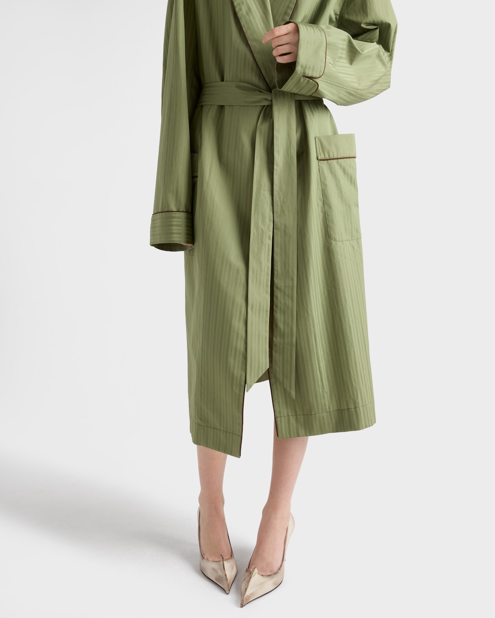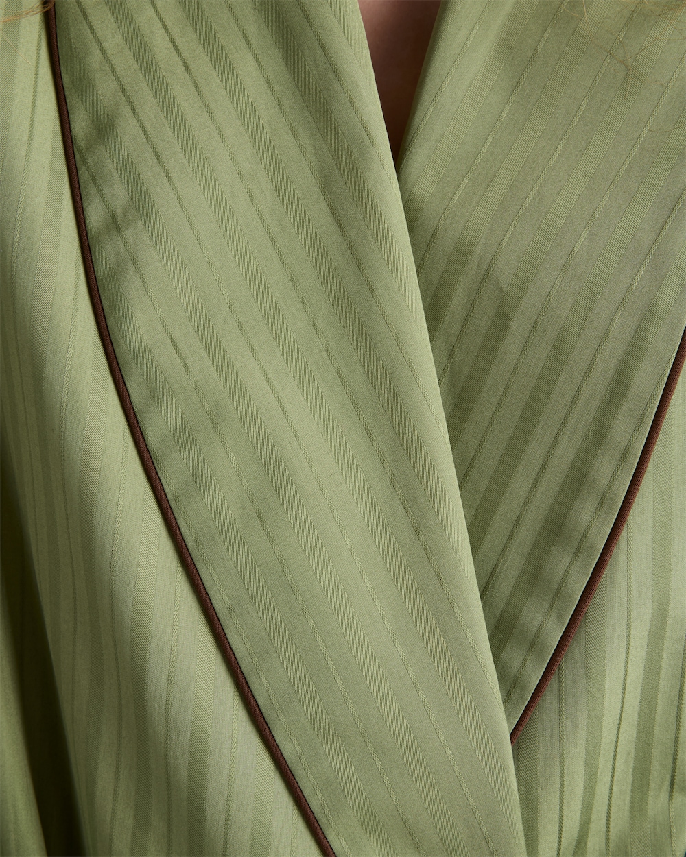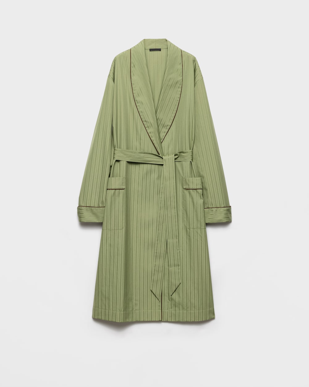 上品で洗練されたデザインのコットンローブ。クラシックなシルエットにショールカラーをあしらい、コントラストの効いたパイピングが特徴です。